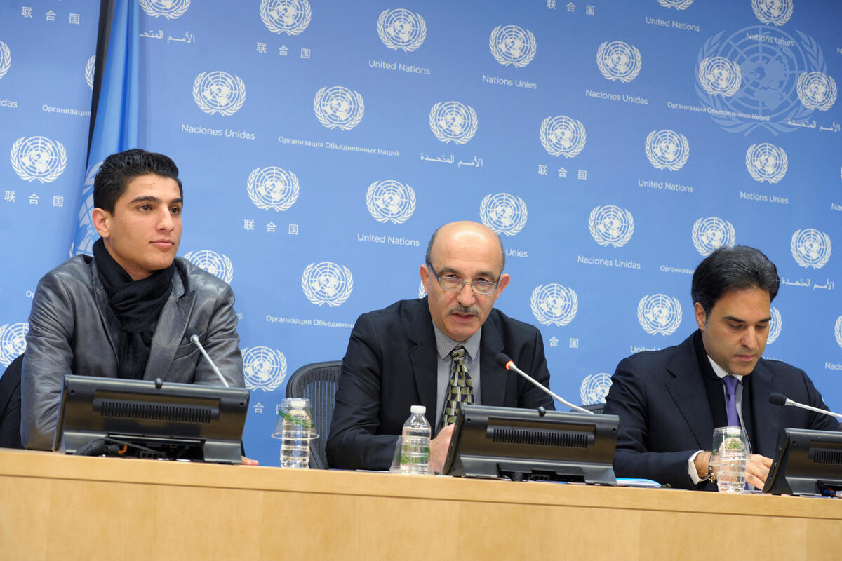 Sami Mshasha (centre), Spokesperson for the UN Relief and Works Agency for Palestine Refugees in the Near East (UNRWA), speaks to correspondents during a press conference in which Mohammed Assaf (left), UNRWA Youth Ambassador, made a statement on the forthcoming International Day of Solidarity with the Palestinian People (29 November). Also on panel was Mazen Hayek (right), Spokesman for Middle East Broadcasting Corporation (MBC).