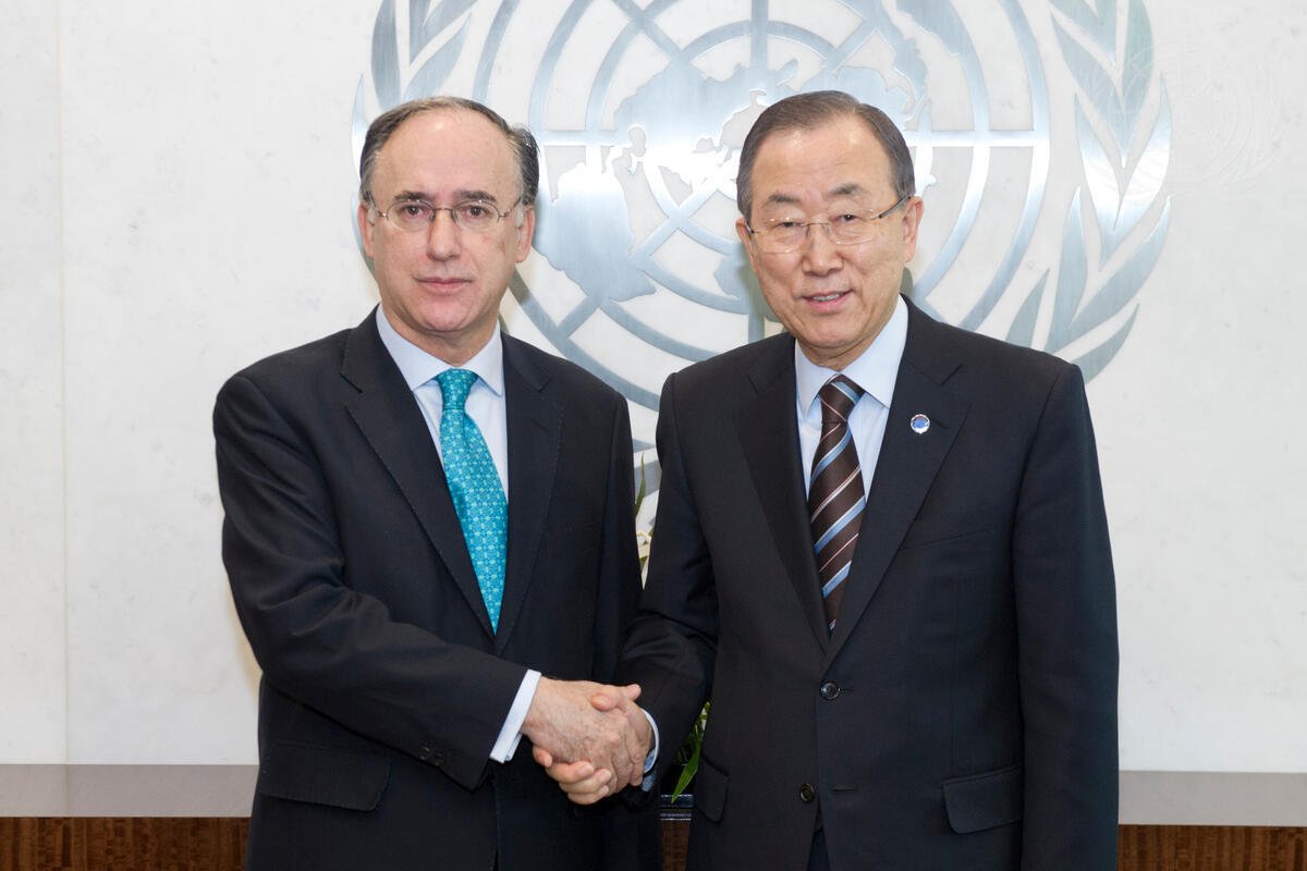 Fernando Arias (left), outgoing Permanent Representative of Spain to the UN, pays a farewell call on Secretary-General Ban Ki-moon.