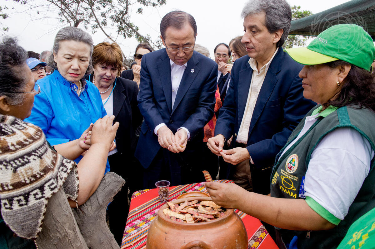 Secretary-General Ban Ki-moon (centre) and his wife, Yoo Soon-taek (second from left), visit an afforestation project for degraded and vulnerable areas in Lima, Peru.