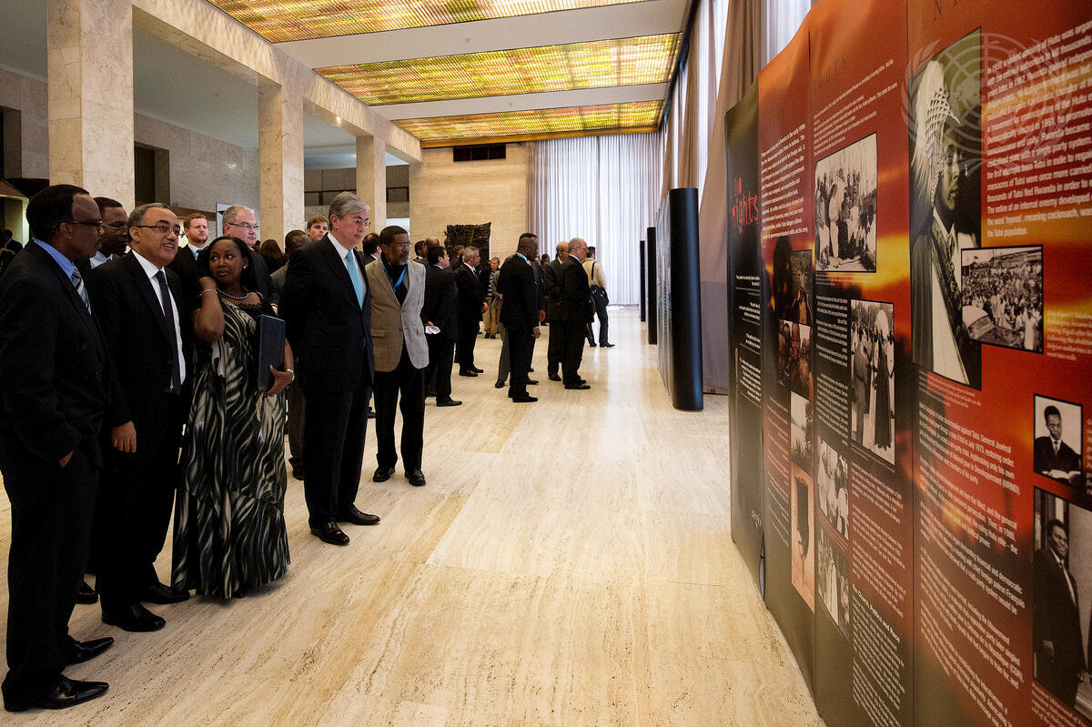 Officials view an exhibition at the UN Office in Geneva (UNOG) in connection with the International Day of Reflection on the 1994 genocide in Rwanda (7 April). Among those pictured: Soline Nyirahabimana (third from left, front row), Permanent Representative of the Republic of Rwanda to UNOG; and Kassym-Jomart Tokayev (centre, with blue tie), Director-General of UNOG.