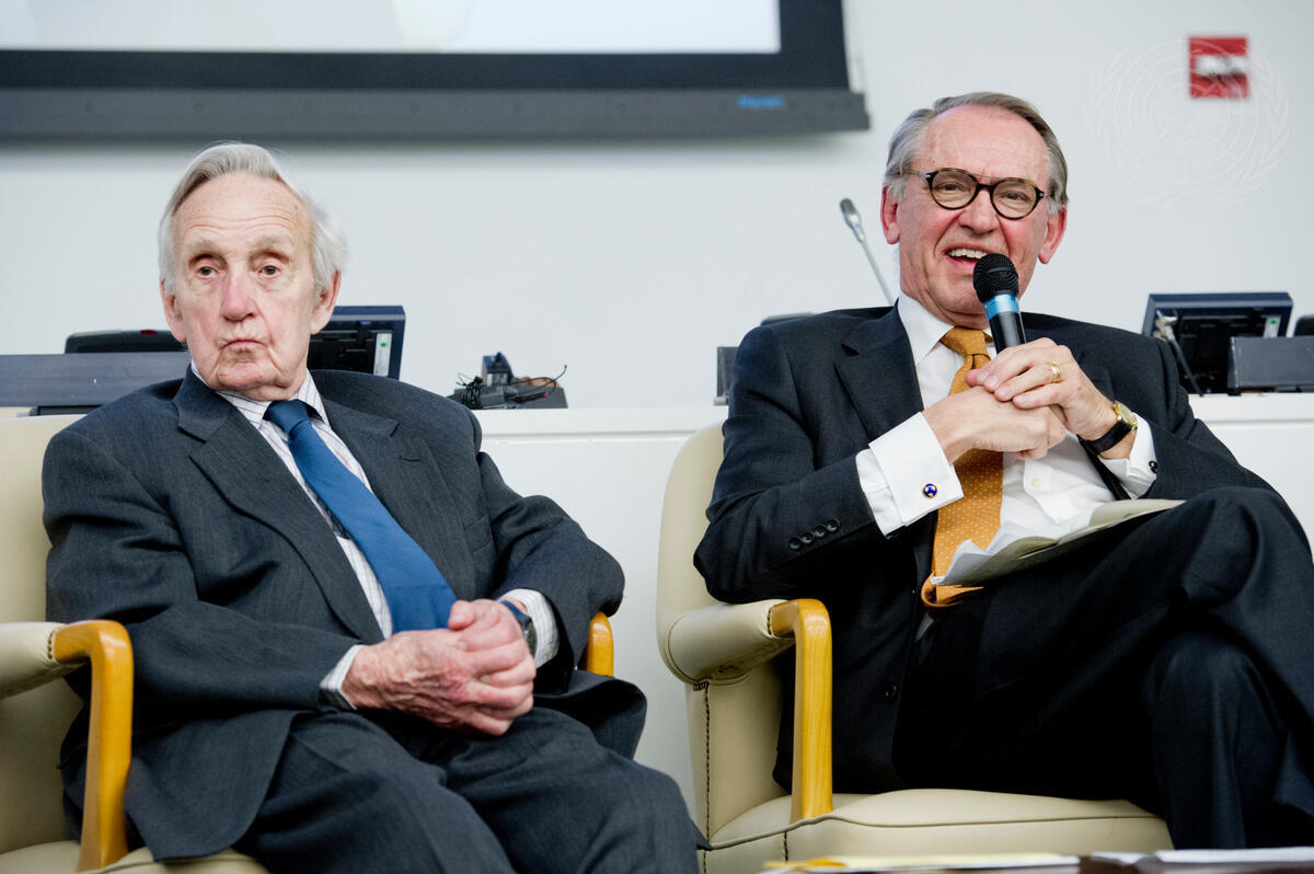 Brian Urquhart, former Under-Secretary-General for Political Affairs and close associate of Hammarskjöld, and Deputy Secretary-General Jan Eliasson participate in a panel discussion.