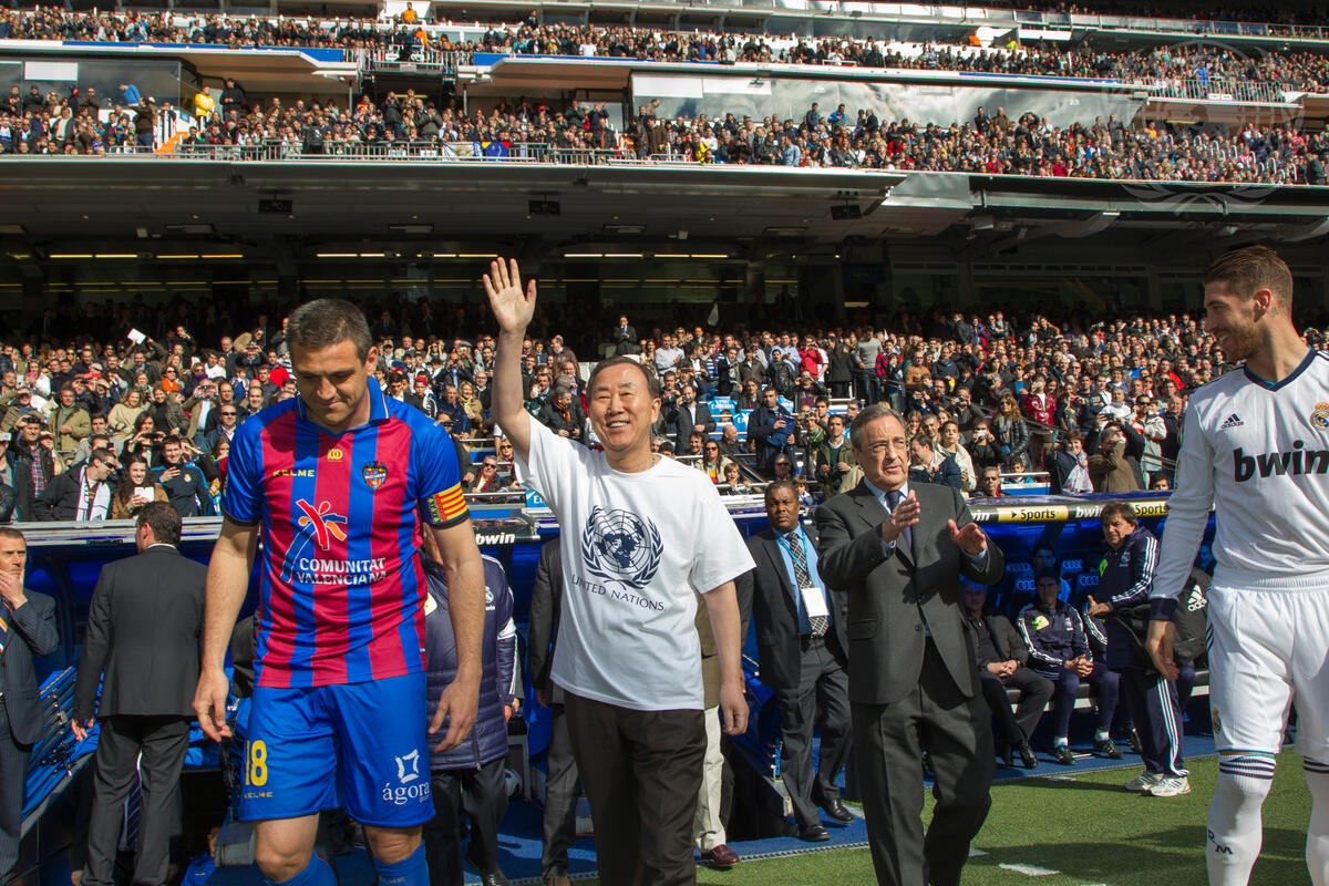 Secretary-General Ban Ki-moon waves at the crowd before kicking off the Real Madrid-Levante football match at the Santiago Bernabéu stadium. Mr. Ban was wearing a white T-shirt with the number 1,000 on the back, signifying the number of days remaining to take action before the deadline of the anti-poverty targets -- the Millennium Development Goals (MDGs).
