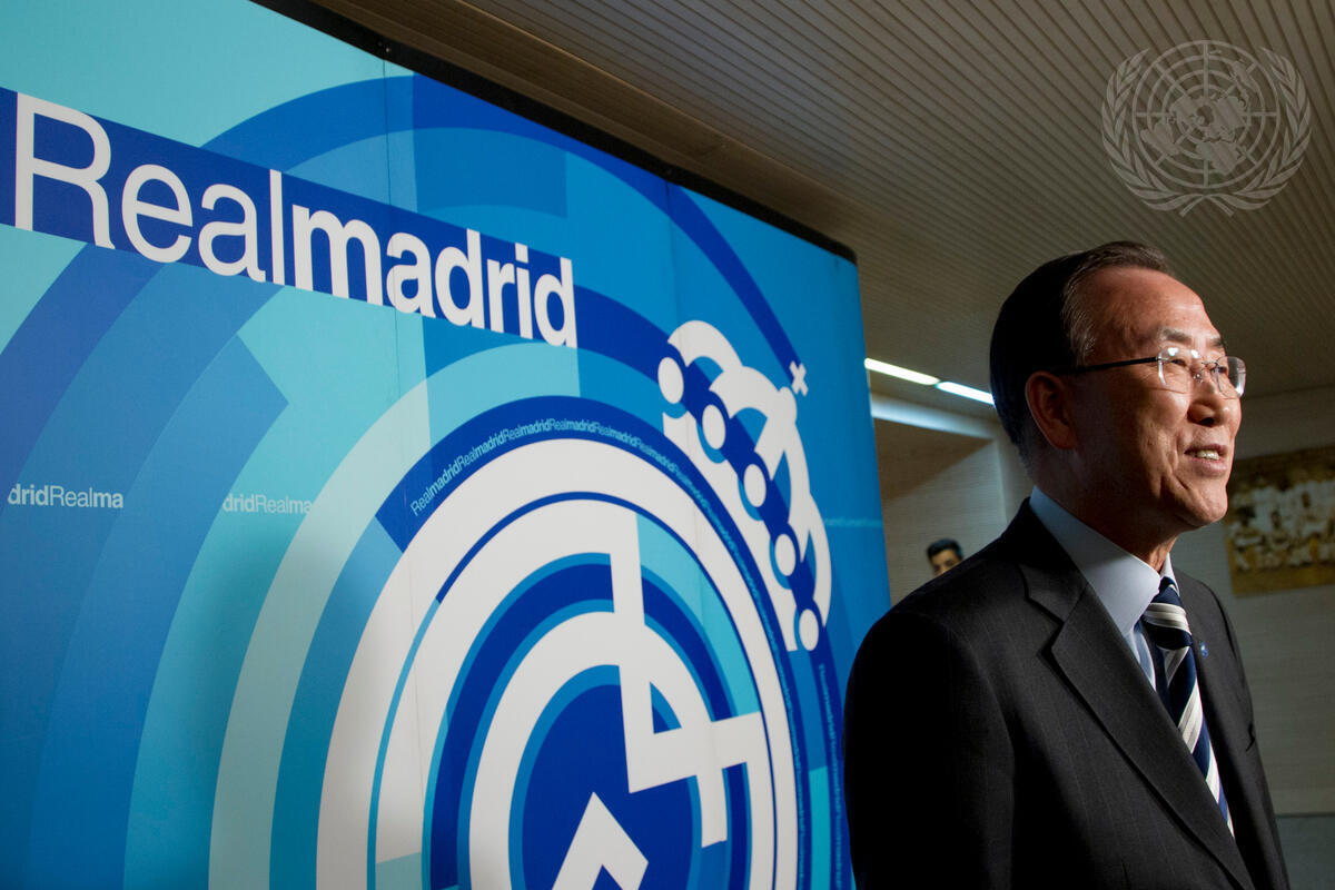Secretary-General Ban Ki-moon at the Santiago Bernabéu stadium. Mr. Ban performed a ceremonial kick-off before the Real Madrid-Levante football match to raise awareness not just of the importance of achieving the MDGs, but also of the role that sports can play in tackling poverty, as well as promoting education, health, development and peace.