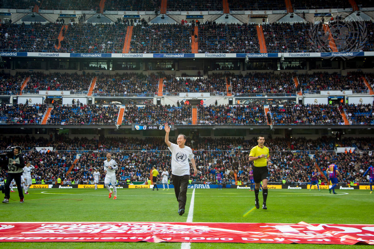 Secretary-General Ban Ki-moon waves at the crowd following his ceremonial kick-off before the Real Madrid-Levante football match at the Santiago Bernabéu stadium. Mr. Ban was wearing a white T-shirt with the number 1,000 on the back, signifying the number of days remaining to take action before the deadline of the anti-poverty targets -- the Millennium Development Goals (MDGs).