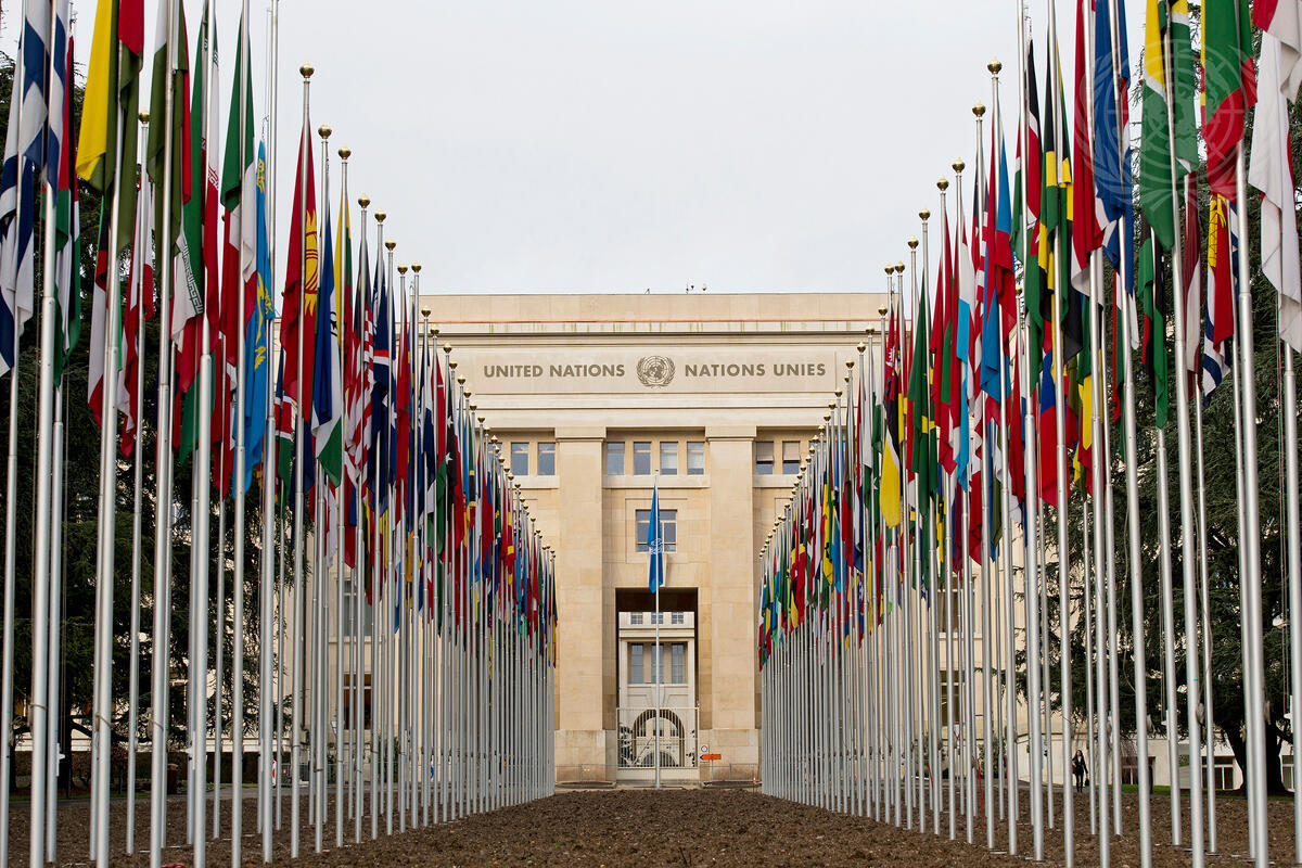 The flags of the 193 UN Member States fly at the Palais des Nations, seat of the UN Office at Geneva, after completion of the renovation of the entrance path to the Palais, known as “Allée des drapeaux” (meaning ""Flags Way"").