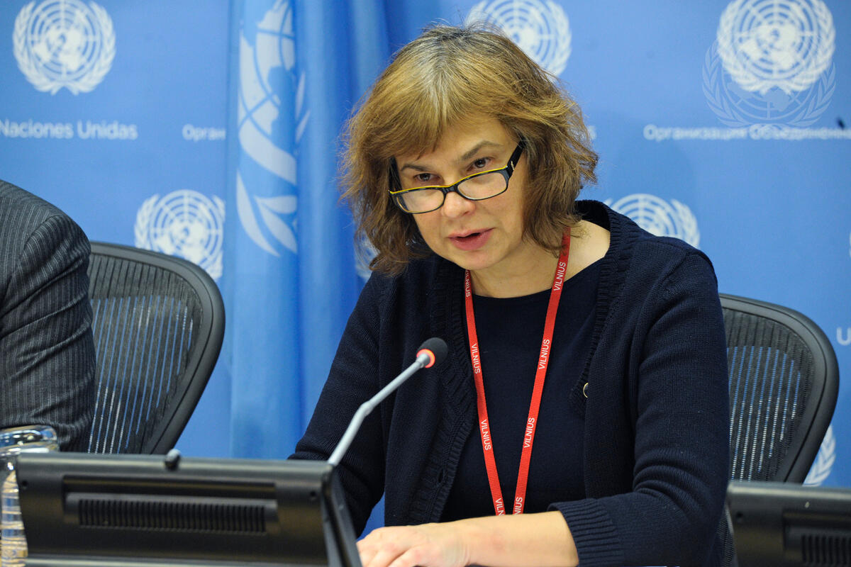 Raimonda Murmokaité, Permanent Representative of Lithuania to the UN and President of the Security Council for the month of February, briefs journalists on the Council's work programme for the month.