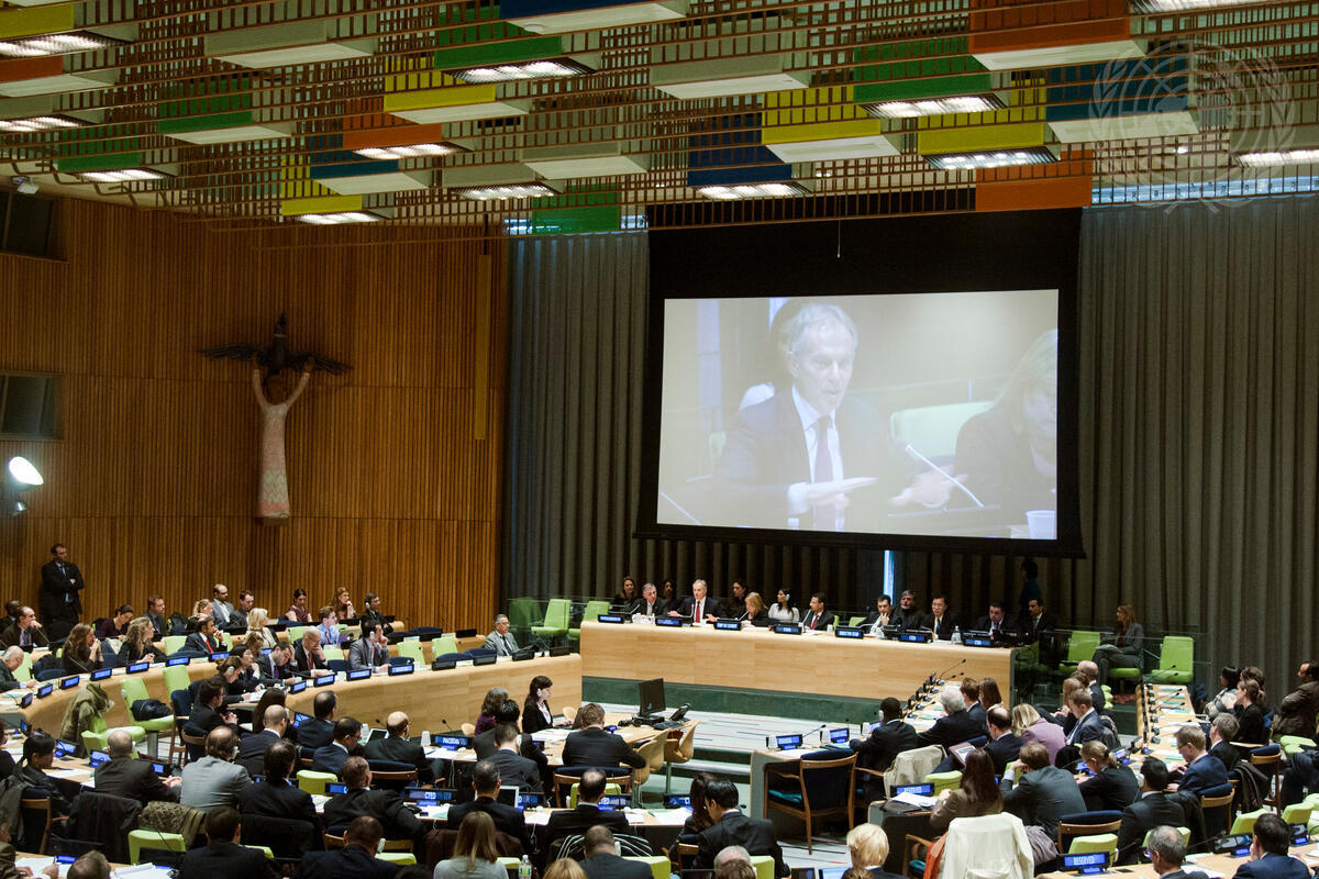 A wide view of the Trusteeship Council Chamber as Tony Blair (shown on screen), Patron of the Tony Blair Foundation, briefs an open session of the Security Council Committee on Counter-Terrorism on the subject of countering violent extremism through education.
