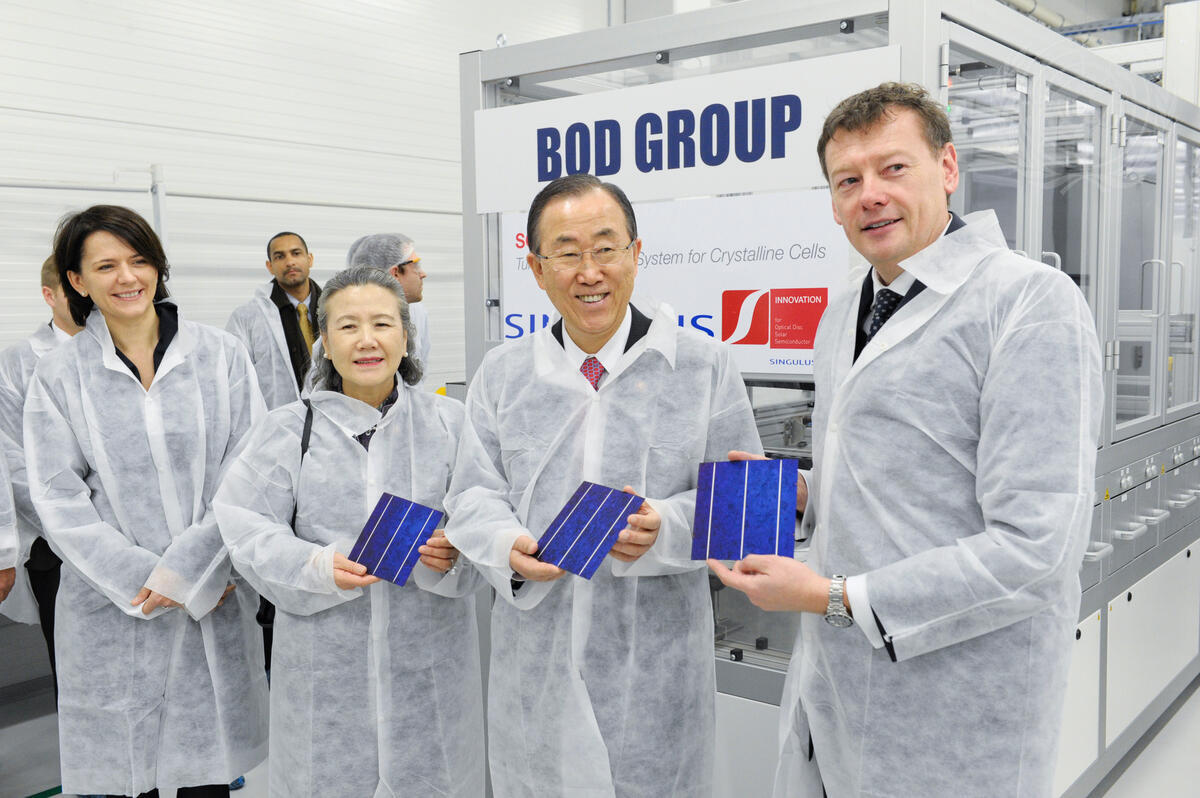 Secretary-General Ban Ki-moon (centre right) and his wife, Yoo Soon-taek (centre left), visit Baltic Solar Energy, a company specialized in sustainable energy projects, in Vilnius, Lithuania.