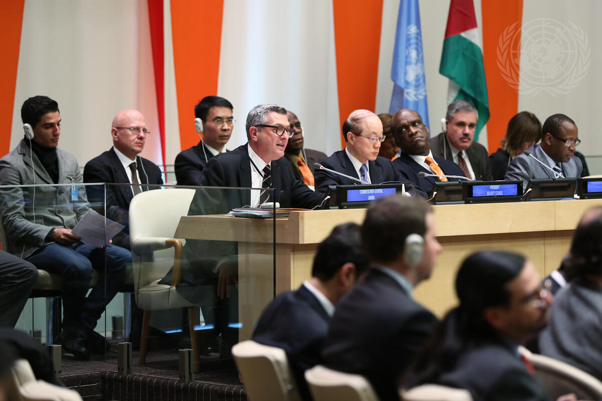 Filippo Grandi (at podium, left), Commissioner-General of the UN Relief and Works Agency for Palestine Refugees in the Near East (UNRWA), addresses the meeting.