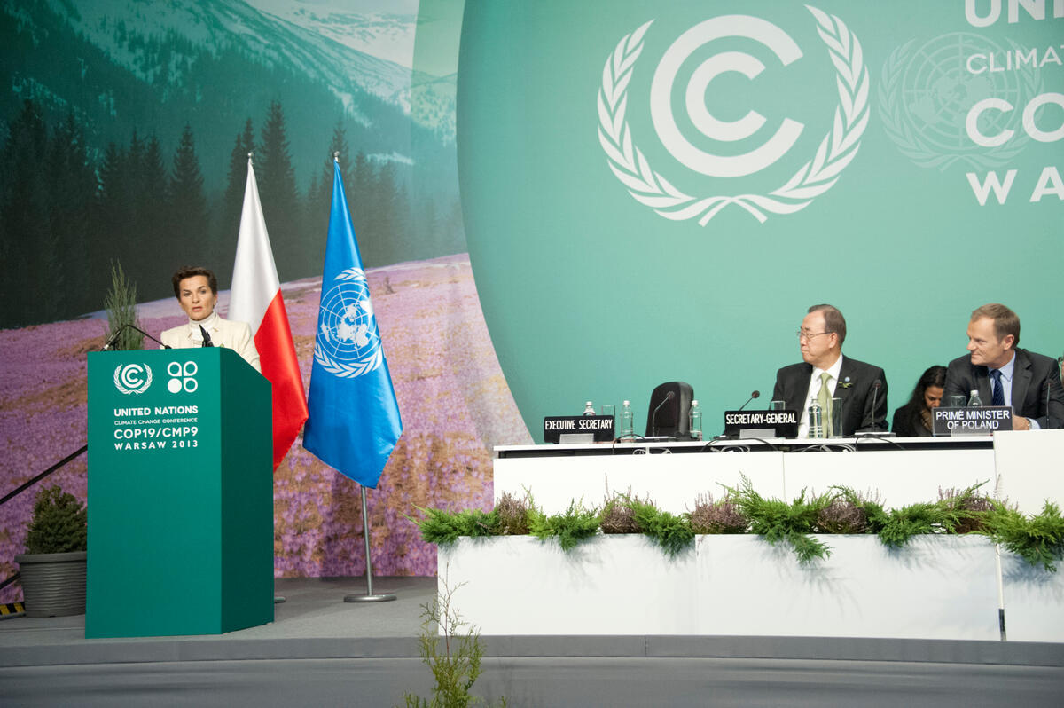 Christiana Figueres (left), Executive Secretary of the United Nations Framework Convention on Climate Change (UNFCCC), addresses the opening of the High-level Segment of the UN Climate Change Conference (UNFCCC COP19/CMP9) in Warsaw. Also pictured: Secretary-General Ban Ki-moon (centre) and Donald Tusk, Prime Minister of the Republic of Poland.