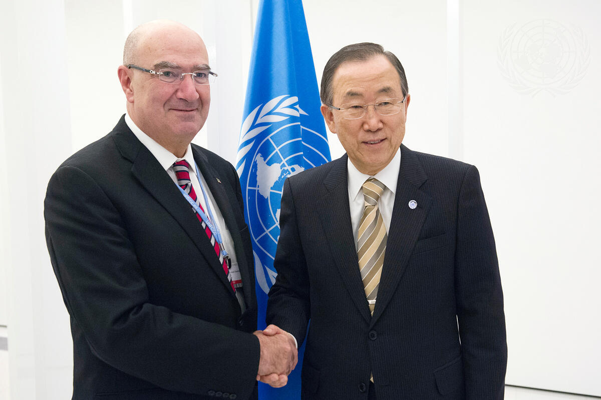 Secretary-General Ban Ki-moon (right) meets with Juan José Guerra Abud, Minister of Environment and Natural Resources of Mexico, in Warsaw, Poland.