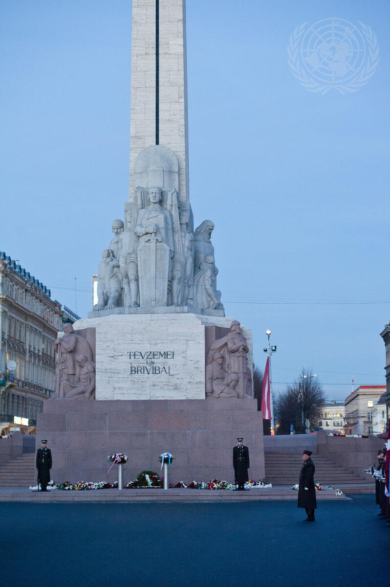 Secretary-General Ban Ki-moon participated in a wreath-laying ceremony at the Freedom Monument, built to honour troops killed in the Latvian War of Independence, in Riga, Latvia.