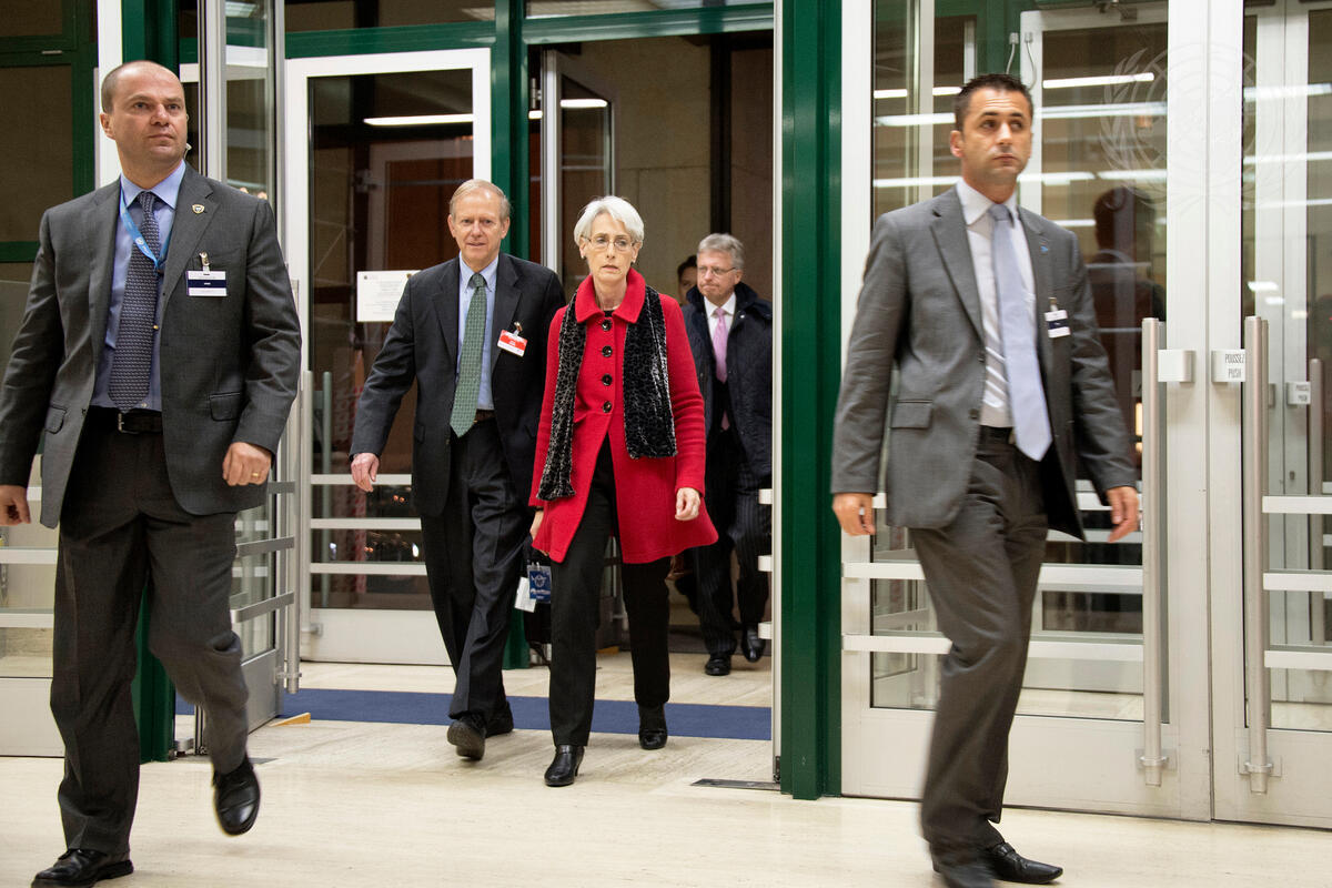 Wendy Sherman (centre, in red coat), United States Under Secretary of State for Political Affairs, arrives at the talks in Geneva.