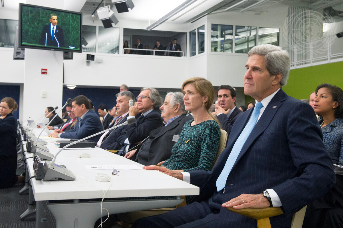 John F. Kerry (front, right), Secretary of State of the United States of America, listens as Barack Obama, President of the United States, addresses the general debate of the sixty-eighth session of the General Assembly. Also pictured: Samantha Power (left of Mr. Kerry), Permanent Representative of the United States to the UN, and Susan Rice (behind Mr. Kerry, on right), United States National Security Advisor.