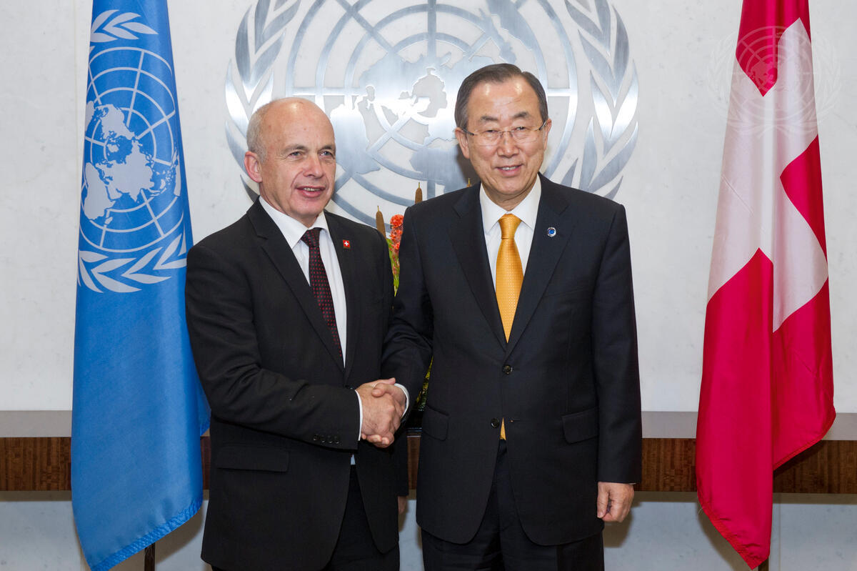 Secretary-General Ban Ki-moon (right) meets with Ueli Maurer, President of Switzerland.