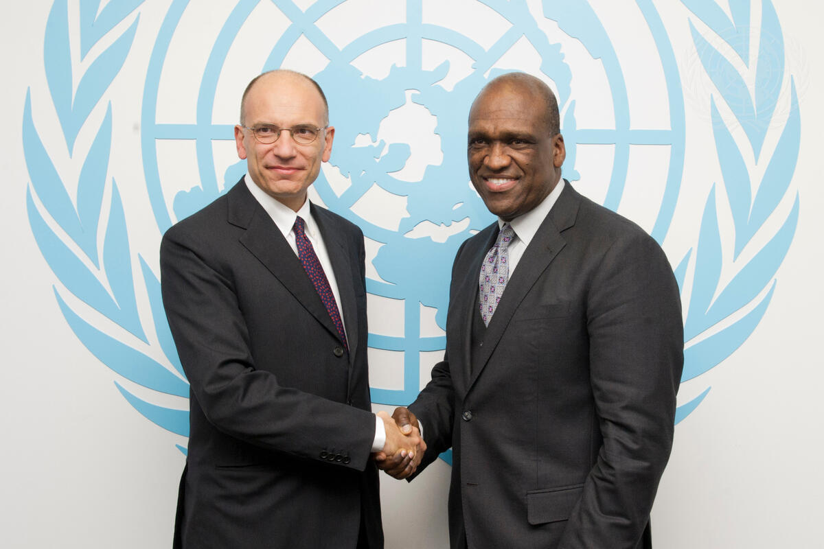 John Ashe (right), President of the sixty-eighth session of the General Assembly, meets with Enrico Letta, Prime Minister of Italy.