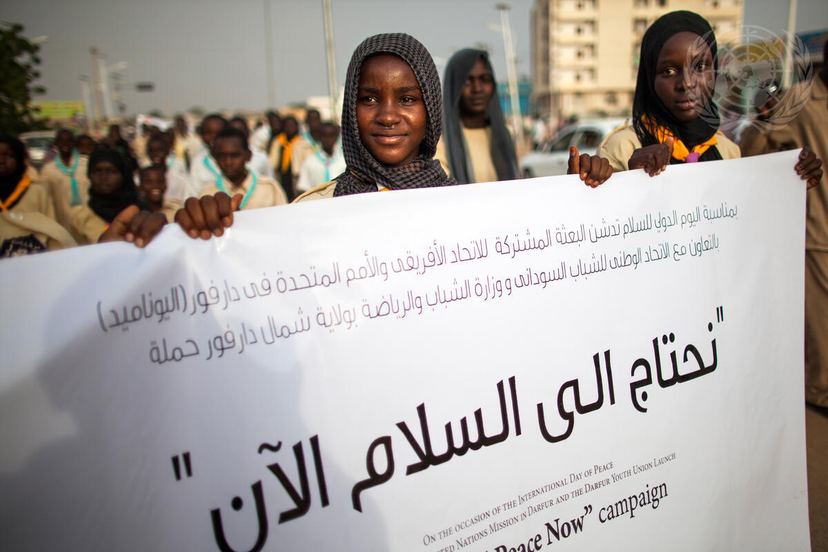 Female members of Sudan’s Boy Scout and Girl Guide association, carrying a banner with the slogan, “We Need Peace Now”, march in the parade organized by the African Union-UN Hybrid Operation in Darfur (UNAMID) to commemorate the International Day of Peace (21 September). The event launches a six-month campaign to support the peace process in Darfur.