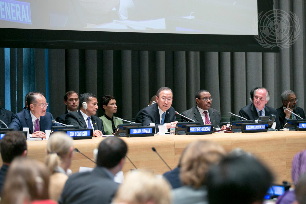 Secretary-General Ban Ki-moon (at podium, centre) convenes the High-Level Forum on the Millennium Development Goals (MDGs), ""Accelerating Action and Partnering for Impact”. He is joined by, from left, Jim Yong Kim, President of the World Bank Group; Ollanta Humala Tasso, President of Peru; Hailemariam Dessalegn, Prime Minister of Ethiopia; and Paul Polman, Chief Executive Officer of Unilever.