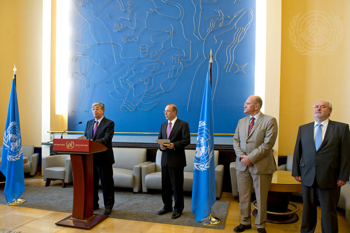 Kassym-Jomart Tokayev (left), Director-General of the UN Office at Geneva (UNOG), leads an oath of office ceremony for staff members appointed to the United Nations in 2013.