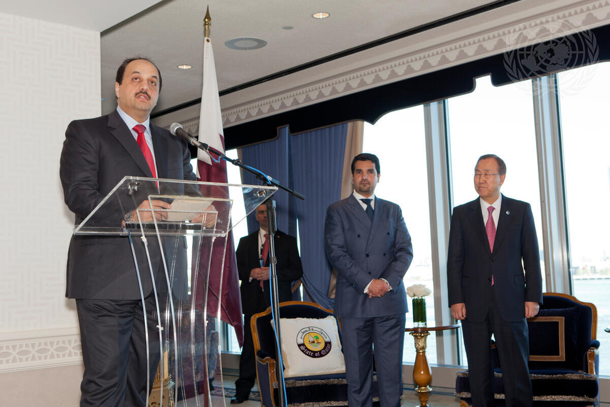 Khalid Bin Mohamed Al-Attiyah (left), Minister for Foreign Affairs of the State of Qatar, speaks at the inauguration of the East Lounge at UN Headquarters, alongside Secretary-General Ban Ki-moon (right) and Sheikh Meshal Hamad M.J. Al-Thani, Qatar’s Permanent Representative to the UN.