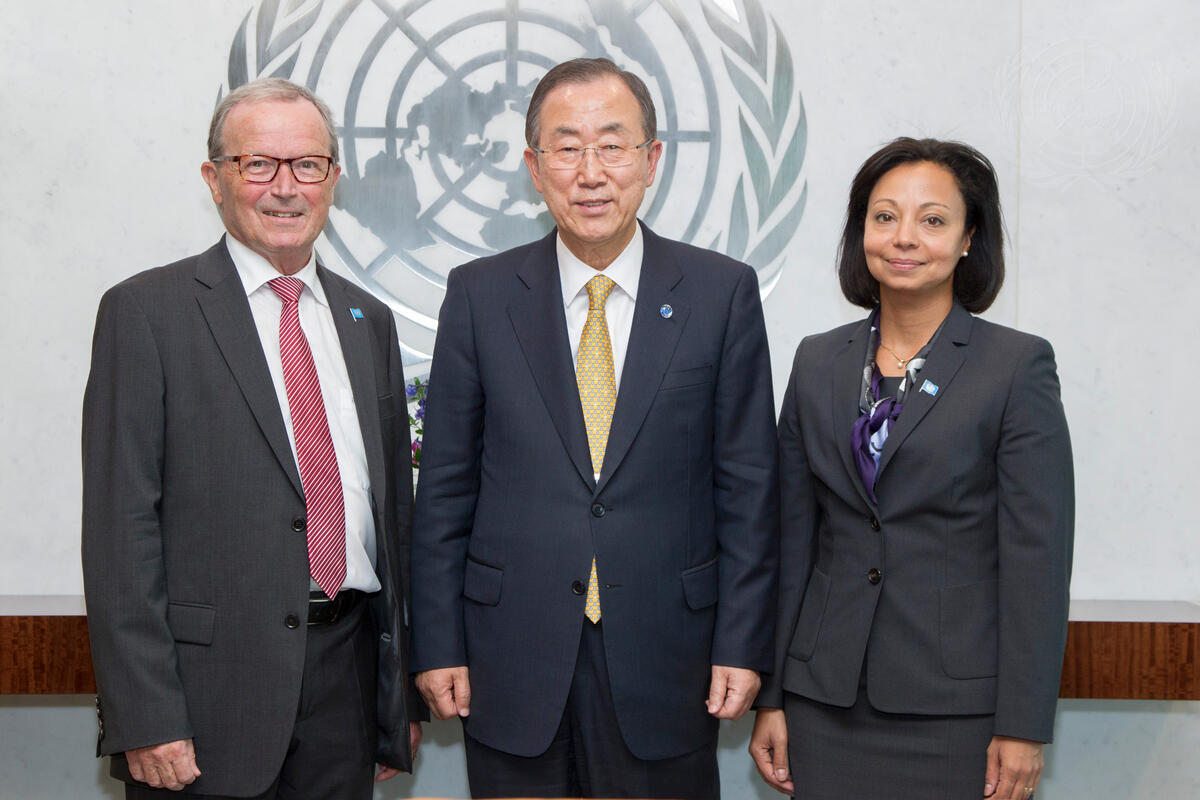 Secretary-General Ban Ki-moon (centre) meets with Kjeld Kirk Kristiansen (left), Chairman of the LEGO Foundation; and Randa Grob-Zakhary, Chief Executive Officer of the Foundation.