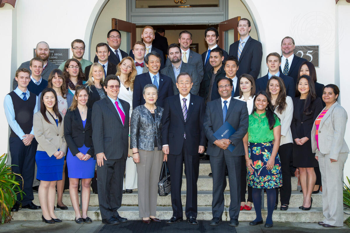 Secretary-General Ban Ki-moon (front, centre) and his wife, Yoo Soon-taek (left of Mr. Ban) pose for a group photo with students and faculty of the Monterey Institute of International Studies in Monterey, California. Also pictured: Kim Won-soo (behind Mr. Ban, on left), Special Adviser to the Secretary-General on Change Implementation.