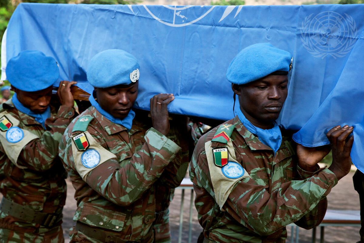 Peacekeepers from Benin carry the coffins of their colleagues during a ceremony held for three peacekeepers of the UN Multidimensional Integrated Stabilization Mission in Mali (MINUSMA) who died in the last two weeks. Two soldiers from Chad were killed during a suicide attack in Tessalit while one soldier from Niger died in Gao due to illness.