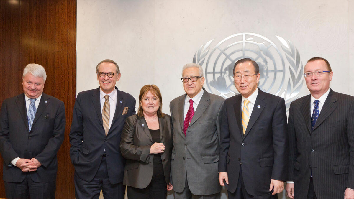 Secretary-General Ban Ki-moon (second from right) meets with Lakhdar Brahimi (third from right), Joint Special Representative of the UN and the League of Arab States for Syria. Also pictured (from left): Hervé Ladsous, Under-Secretary-General for Peacekeeping Operations; Deputy Secretary-General Jan Eliasson; Susana Malcorra, Chef de Cabinet of the Secretary-General; and Jeffrey D. Feltman, Under-Secretary-General for Political Affairs.
