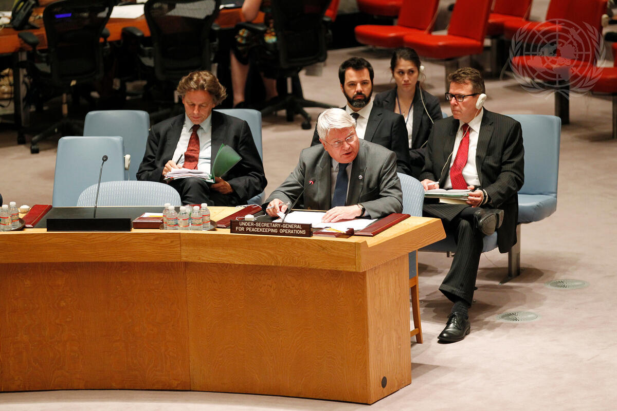 Hervé Ladsous, Under-Secretary-General for Peacekeeping Operations, addresses the Security Council during today's discussions on the latest Report of the Secretary-General on the situation in Mali (S/2014/403). Seated behind Mr. Ladsous are, from left: Albert Gerard (Bert) Koenders, Special Representative and Head of the UN Multidimensional Integrated Stabilization Mission in Mali (MINUSMA); and Sébastien Lapierre and Kevin S. Kennedy from the Mali Integrated Operational Team, UN Department of Peacekeeping Operations.