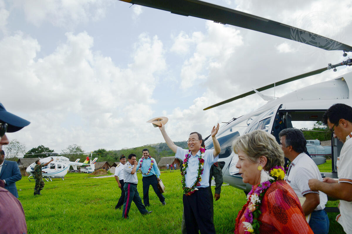 Secretary-General Ban Ki-moon (centre) on his visit to Santa Rita, a rural indigenous community about 200 kilometres away from Santa Cruz de la Sierra, where he is to address the following day the 50th anniversary summit of the Group of 77 and China. Also pictured, Alicia Bárcena (third from right), Executive Secretary of the UN Economic Commission for Latin America and the Caribbean (ECLAC).