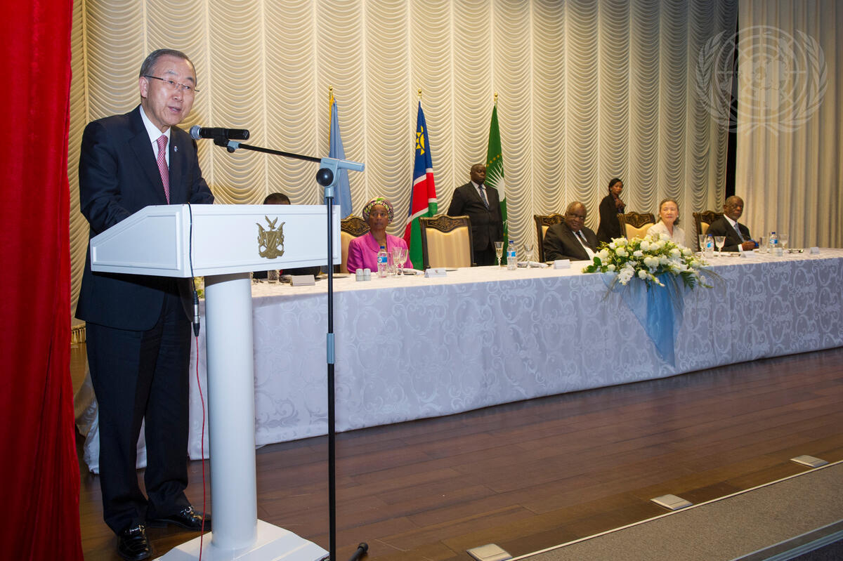 Secretary-General Ban Ki-moon (left) speaks at a dinner hosted in his honour by Hifikepunye Pohamba (third from right at table), President of the Republic of Namibia. Also pictured, Mr. Ban’s wife, Yoo Soon-taek (second from right).