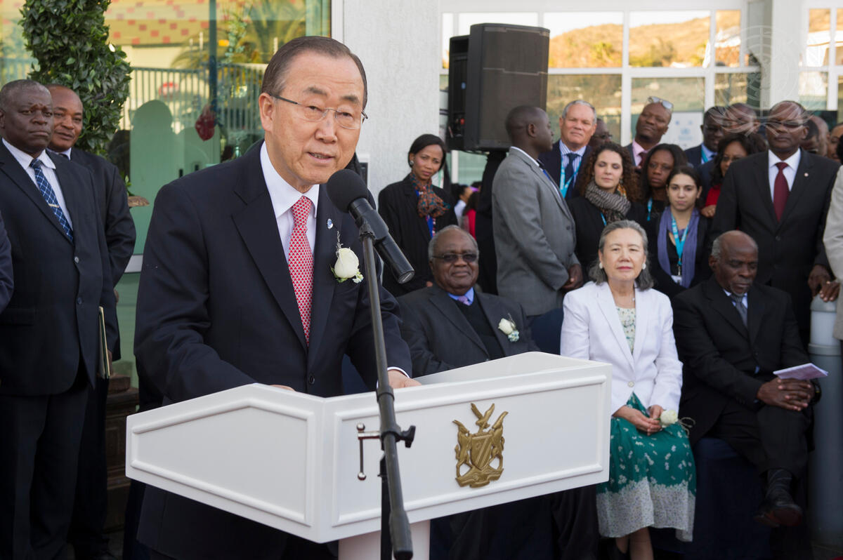 Secretary-General Ban Ki-moon (at lectern) speaks at the inauguration of the United Nations House in Windhoek, which will be home to twelve UN Agencies. Taking part in the event was Hifikepunye Pohamba (seated on Mr. Ban's left), President of the Republic of Namibia. At the President’s side is Yoo Soon-taek, wife of the Secretary-General.