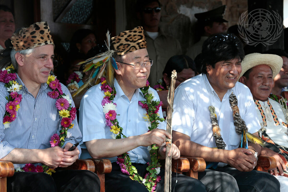 Secretary-General Ban Ki-moon (centre left) visits Santa Rita, a rural indigenous community about 200 kilometres away from Santa Cruz de la Sierra, with Evo Morales Ayma (centre right), President of the Plurinational State of Bolivia. Mr. Ban is to address the following day the 50th anniversary summit of the Group of 77 and China in Santa Cruz de la Sierra.