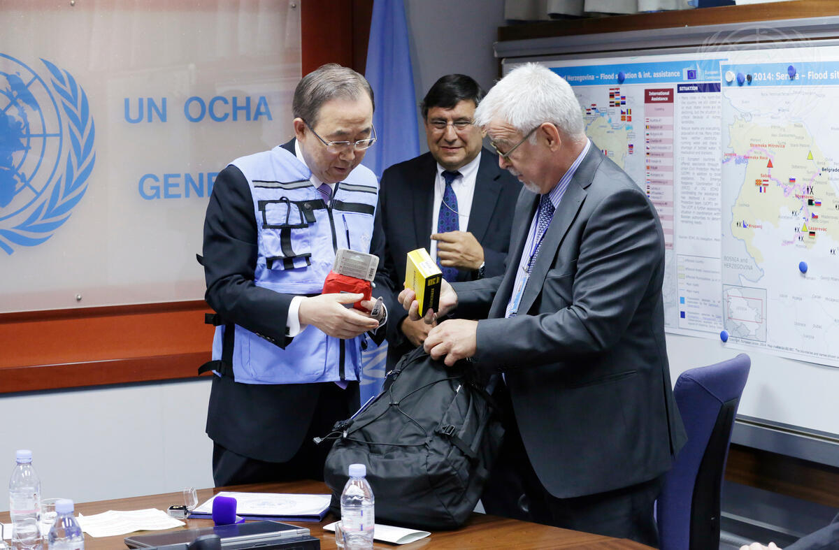 Mr. Ban (left) is shown humanitarian assistance supplies used by the ERCC and OCHA staff in the field.