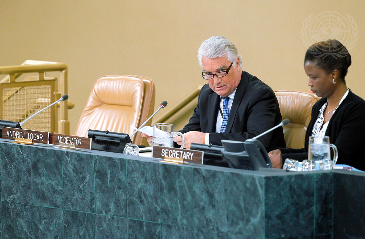 Andrej Logar, Permanent Representative of Slovenia to the UN and Member State Adviser to the President of the General Assembly, moderates one of today's interactive discussions in the General Assembly. The informal hearings are being held as a preparatory process for the high-level meeting of the sixty-ninth session of the General Assembly, to be known as the World Conference on Indigenous Peoples.