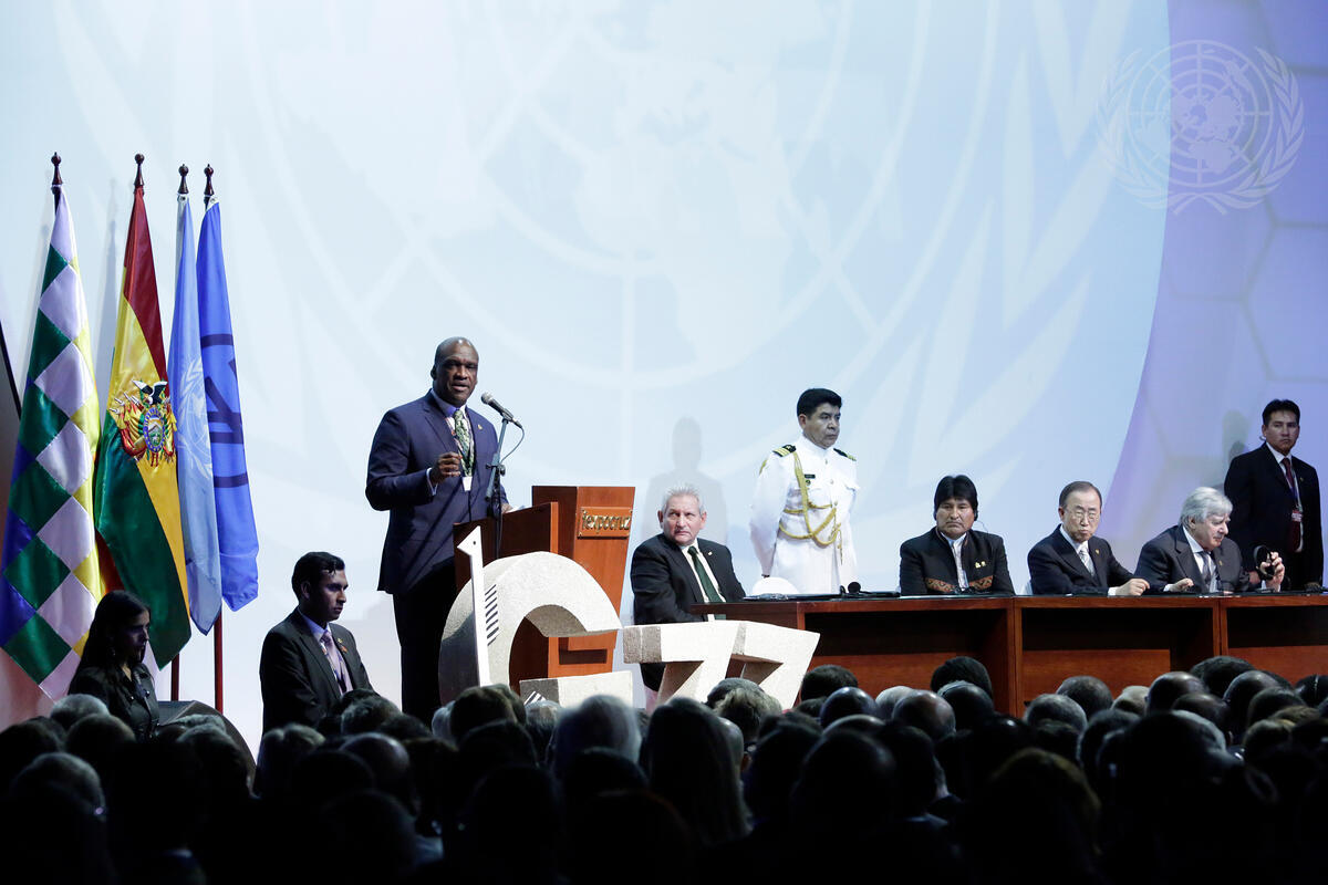 John W. Ashe, President of the sixty-eighth session of the General Assembly, addresses heads of states and government gathered in Santa Cruz, Bolivia for the Fiftieth Commemorative Summit of the Group of 77 and China. Also speaking at the opening ceremony are Secretary-General Ban Ki-moon (seated, second from right) and Evo Morales Ayma, President of Bolivia (seated, second from left).