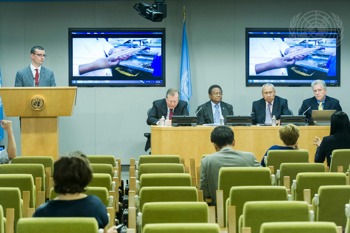 A view of the press briefing room at UN headquarters during a press conference on the sustainable management of fisheries. Addressing journalists were (seated facing camera, from left): Nicholas Rosellini, Deputy Regional Director, Regional Bureau for Asia and the Pacific at the UN Development Programme (UNDP); Caleb Otto, Permanent Representative of the Republic of Palau to the UN; Robert Guba Aisi, Permanent Representative of Independent State