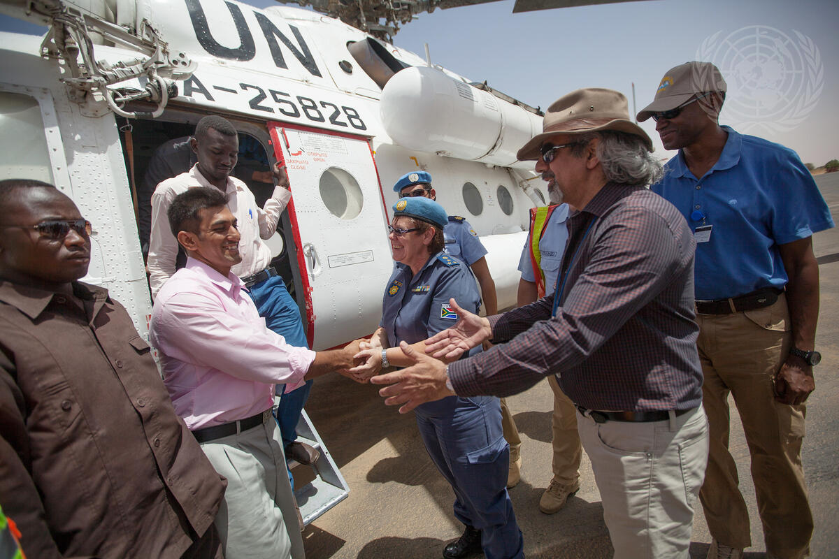 Irfan Jaffery (second from left), international contractor from India working with the African Union-United Nations Hybrid Operation in Darfur (UNAMID), is welcomed by UNAMID Police Commissioner Hester Paneras (centre), at El Fasher Airport, after travelling from Kabkabiya, North Darfur. Mr. Jaffery was abducted in El Fasher, North Darfur, on 11 March, and freed on 12 June in Kabkabiya.