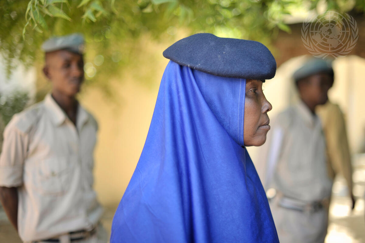A female Somali police officer watches a training exercise taking place at General Kahiye Police Academy in Mogadishu, Somalia. The African Union Mission in Somalia (AMISOM) is currently training one hundred Somali Police officers in a program aimed at equipping the Somali Police Force with the necessary skills to effectively arrest suspects, stop vehicles at checkpoints, and cordon off areas.