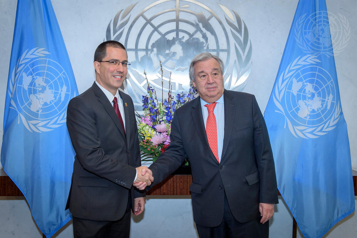 Secretary-General António Guterres (right) meets with Jorge Arreaza, Minister of the People’s Power for Foreign Affairs of the Bolivarian Republic of Venezuela.
