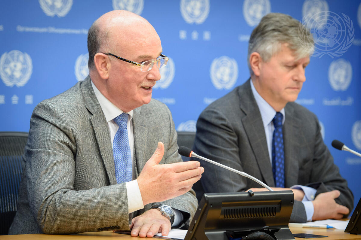 Smaïl Chergui (left), African Union Commissioner for Peace and Security, and Jean-Pierre Lacroix, Under-Secretary-General for the Department of Peace Operations, brief reporters on the Central African Republic as a guests at the noon briefing.