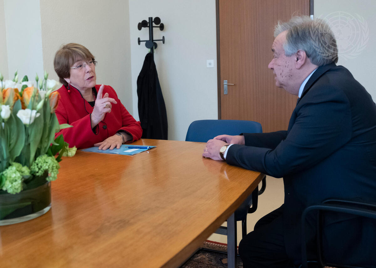 Secretary-General António Guterres (right) meets with Michelle Bachelet, United Nations High Commissioner for Human Rights.