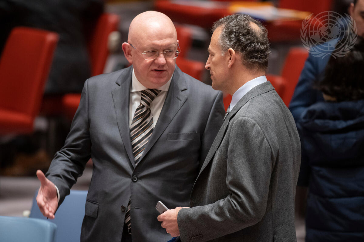 Vassily Nebenzia (left), Permanent Representative of the Russian Federation to the U, speaks with Jonathan R. Cohen, Acting Permanent Representative of the United States to the UN, prior to the Security Council meeting on the situation in the Bolivarian Republic of Venezuela.