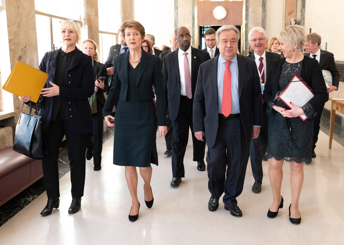 Secretary-General António Guterres second from left speaks with Margot Wallström, Minister for Foreign Affairs of Swede, prior to the opening session of the High-level Pledging Event for the Humanitarian Crisis in Yemen. Also pictured: Simona Sommaruga (second from left), Vice-President of the Federal Council of Switzerland on Conference in Yemen; and Mark Lowcock (behind Mr. Guterres and Ms. Wallström), UN Under-Secretary-General for Humanitarian Affairs and Emergency Relief Coordinator (OCHA).
