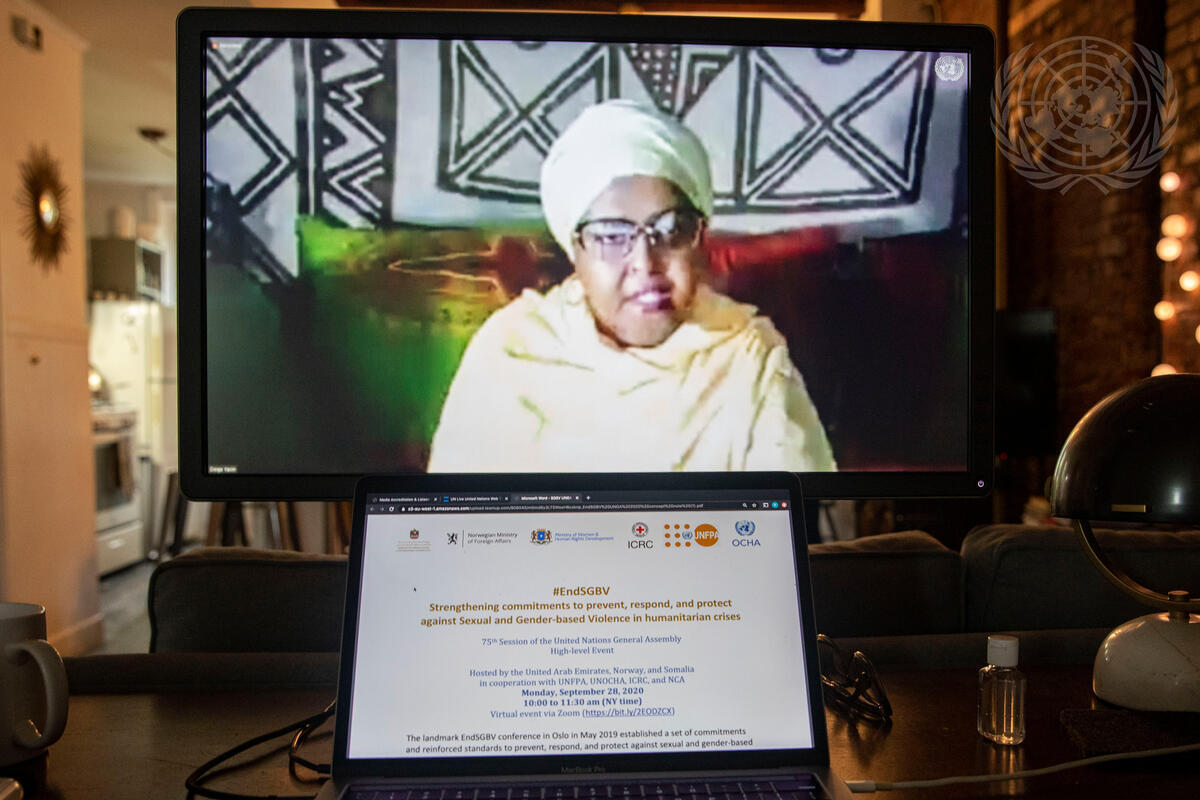 Deqa Yasin, Minister of Women and Human Rights Development of Somalia, addresses the event on sexual and gender-based violence, “Strengthening commitments to prevent, respond, and protect against Sexual and Gender-based Violence in humanitarian crises”.