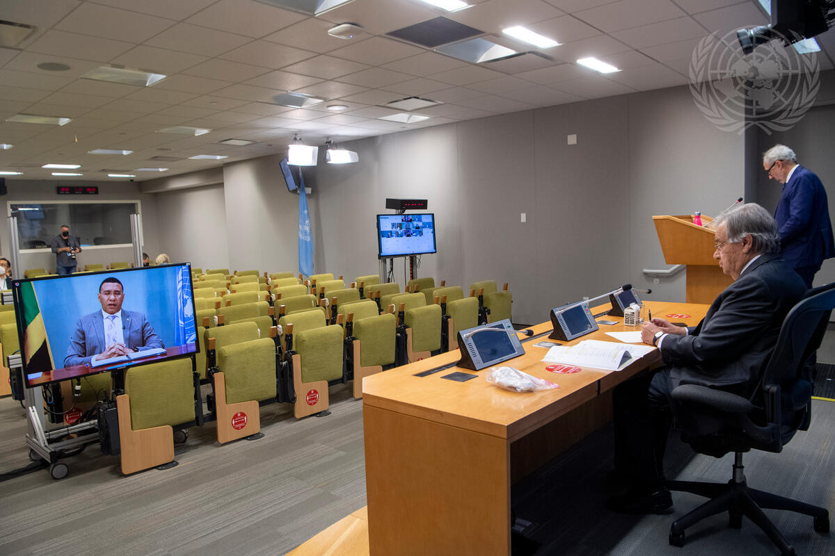 Andrew Holness (on screen), Prime Minister of Jamaica, briefs reporters together with Justin Trudeau (who also particiapted virtually), Prime Minister of Canada, and Secretary-General António Guterres (seated at right). The press conference is on the outcome of the meeting on ""Financing the 2030 Agenda for Sustainable Development in the Era of COVID-19 and Beyond"". Standing at the podium is Stéphane Dujarric, Spokesperson for the Secretary-General.