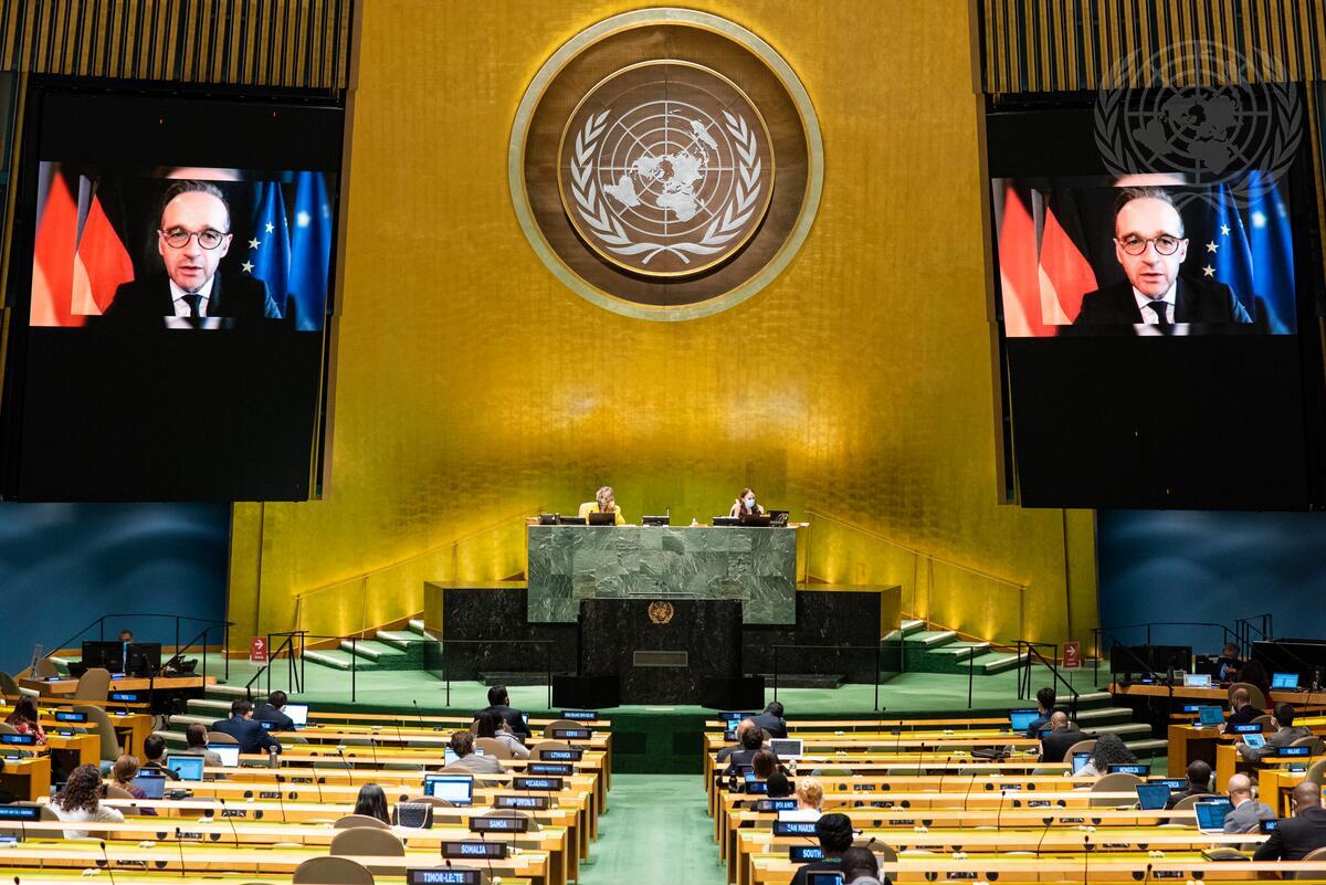 Heiko Maas (on screens), Federal Minister for Foreign Affairs of the Federal Republic of Germany, addresses the general debate of the General Assembly’s seventy-fifth session.