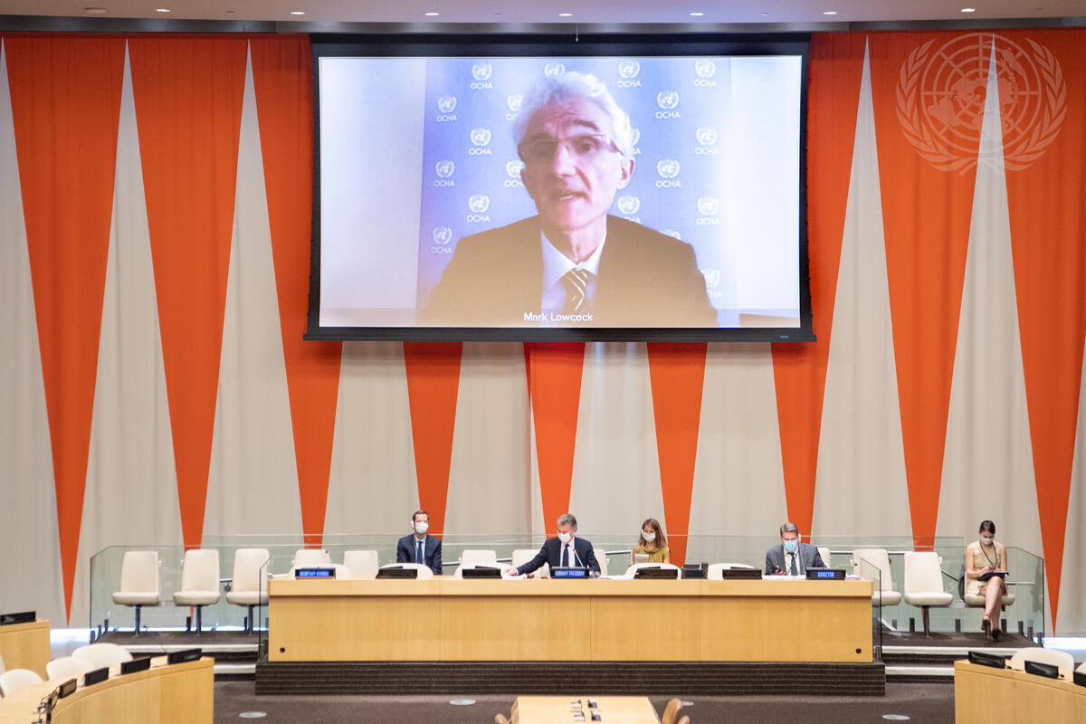 Mark Lowcock (on screen), Under-Secretary-General for Humanitarian Affairs and Emergency Relief Coordinator, briefs the Security Council meeting on the situation in Yemen.
