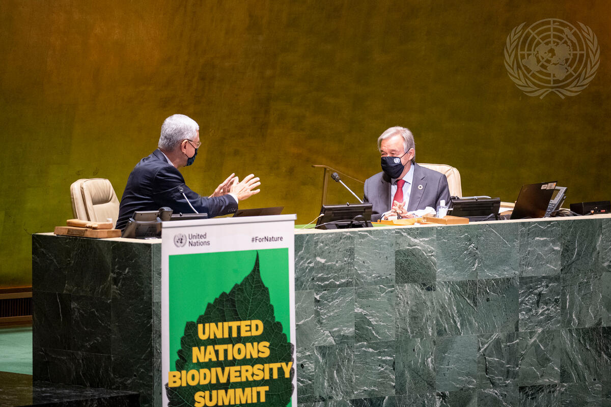 Volkan Bozkir (left), President of the seventy-fifth session of the United Nations General Assembly, speaks with Secretary-General António Guterres ahead of the United Nations Summit on Biodiversity.