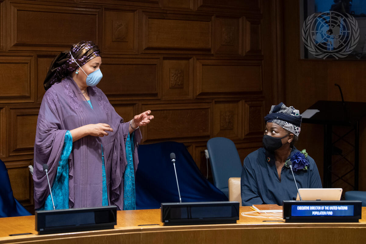 Deputy Secretary-General Amina Mohammed (standing) speaks with Natalia Kanem, Executive Director of the United Nations Population Fund (UNFPA), ahead of the high-level meeting on financing the 2030 Agenda for Sustainable Development in the era of COVID-19 and beyond.